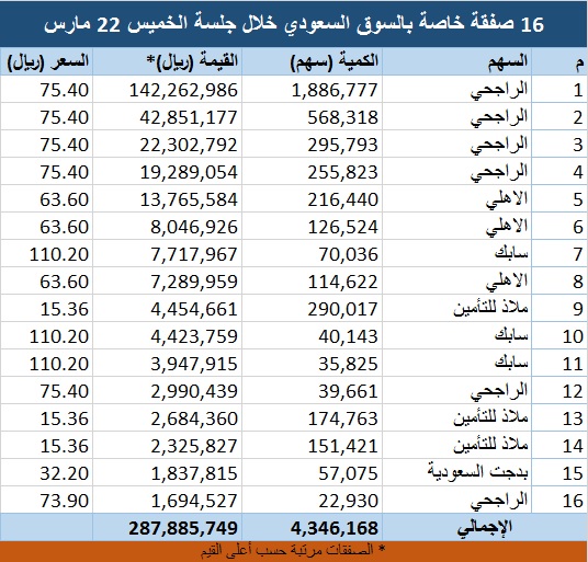 محدث 16 صفقة خاصة بالسوق السعودي أكبرها لـ الراجحي معلومات مباشر