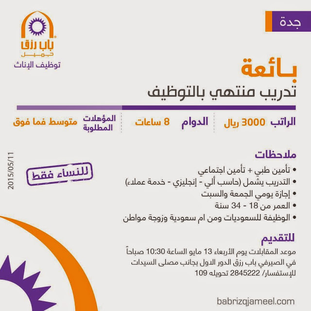 تدريب منتهي بالتوظيف للسيدات بشهادة الثانوي ومافوق والمقابلات يوم الإثنين ب جدة وظائف اليوم