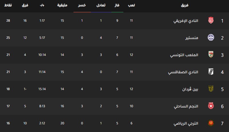 جدول ترتيب الدوري التونسي اليوم بتاريخ 23 12 2019